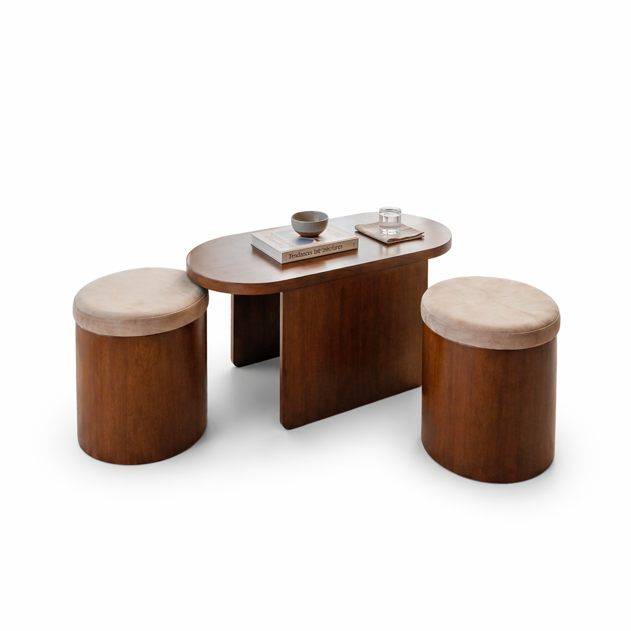 La Mesa de Centro Lisboa Central redefine la funcionalidad con una propuesta elegante y perfectamente integrada. Su diseño de líneas limpias incorpora dos puffs tapizados que se almacenan de forma discreta bajo la estructura, optimizando el espacio sin renunciar al estilo. Esta versatilidad la convierte en la opción ideal para interiores contemporáneos, permitiendo transformar fácilmente una sala formal en un ambiente acogedor y social.